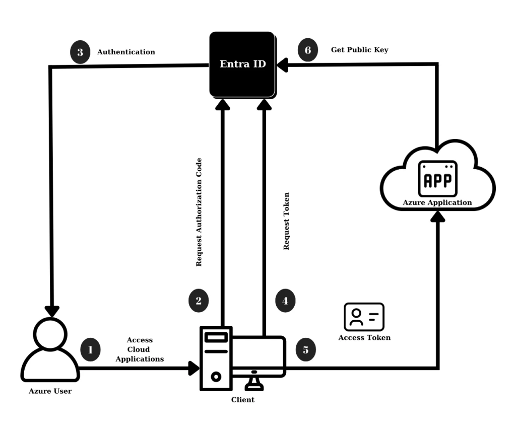 Azure kimlik doğrulama servisi, uygulamalar için OAuth 2.0 ve OpenID kimlik doğrulamalarını kullanmaktadır. Mesela bir web veya mobil uygulama, kullanıcıyı Azure AD’ye yönlendirip yetkilendirme kodu ile yetki tokenları alır. Aşağıdaki görselde örneğine yer verilmiştir. Kullanıcı Entra ID’ye oturum açma isteği gönderir, Entra ID ise bir yetkilendirme kodu verir, uygulama bu kodu access token’a çevirir ve Azure üzerinde yer alan uygulamaya erişim sağlar. Bu akışta, kullanıcı tarayıcı üzerinden yönlendirme ile Azure AD’nin kimlik endpointlerine erişim sağlar.