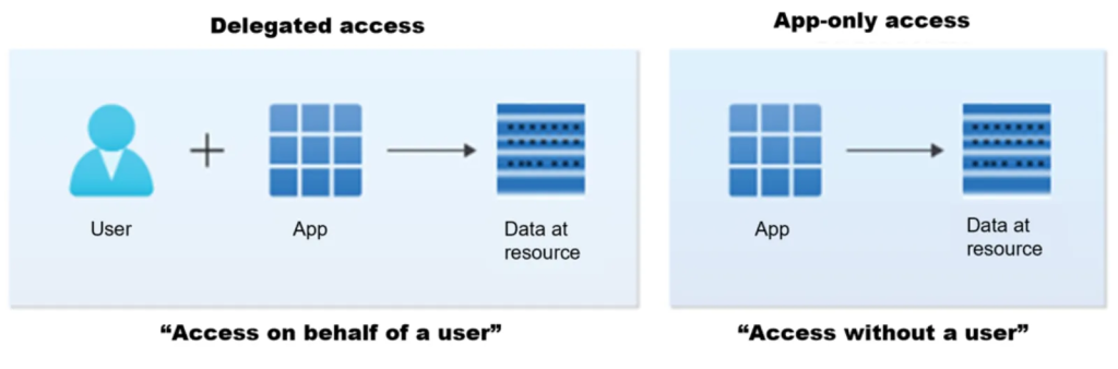 Azure AD’de uygulamalar iki şekilde erişim tokenı kullanabilir. Delegated (yani kullanıcı adı temelli) veya app-only (yani uygulama servis hesabı ile) olarak yetkilendirir. Şekilde bu iki senaryo örneği bulunmaktadır. Sol taraftaki Delegated access modeline kullanıcı uygulamaya oturum açar ve uygulama Microsoft Graph veya başka bir API aracılığıyla kullanıcının izinleri dahilinde yetkilerini getirir. Sağdaki görselde yer alan App-only access örneğinde ise uygulama, kullanıcı olmadan, sadece kendi servis hesabı ile arka planda çalışmaktadır. Bu iki görsel ise Azure AD’nin desteklediği iki farklı yetkilendirme sistemini gösterir.
