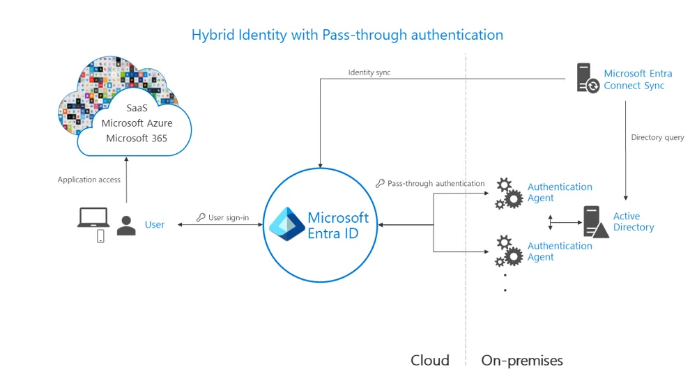 • Pass-through Authentication (PTA): Kullanıcı Azure AD’ye giriş yapmak istediğinde parola kontrolü Azure’a iletilir ve arka planda kurum içindeki Azure ajanı ile Active Directory’de doğrulanır. Yani şifre doğrulama kurum içinde gerçekleşir. Böylece AD içindeki şifre politikaları direkt uygulanır. Ancak on-prem bağlantısı koparsa oturum açma işlemi başarısız olur.