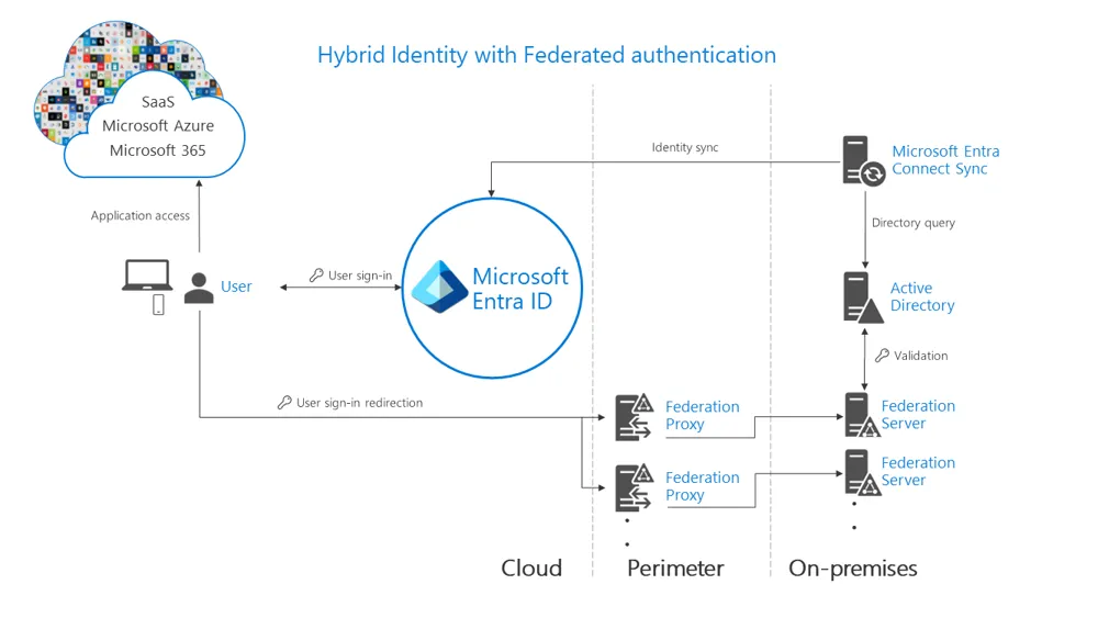 • Federasyon (AD FS): Azure AD, oturum açma akışını tam olarak kurum içindeki ADFS gibi bir kimlik sağlayıcısına yönlendirir. Kullanıcı tarayıcısı doğrudan kurum içi ADFS sunucularına bağlanır ve ADFS üzerinden kimlik doğrulaması yapılır. Bu sayede kuruluş kendi çok faktör doğrulama veya özel oturum açma senaryolarını (örneğin yalnızca iç ağdan giriş, mfa, usb auth vb.) aynen devam ettirebilir.